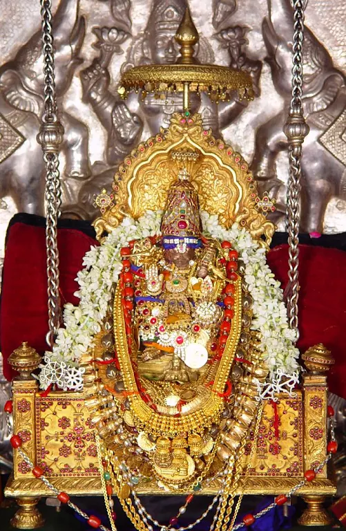 In circa 1378, some 600 years back, Swami Srinivasacharya was born. He was the son of Kidambi Kesavacharya. They were in Melkote, near Mysore. Srinivasacharya went to Kanchipuram and learnt all scriptures from Swami Gadikasatham Ammal. When he was 20 years old, he was commanded by Lord Sri Narasimha to come to Ahobilam. The Lord in the guise of an elderly Brahmin, administered mantras and made Srinivasacharya a sanyasi [ascetic]. He was christened as Sri Satakopa yathi. This is the title with which all Azhagiya singars are decorated. At that time the Utsava Moorthy of Sri Malola, sprang up and reached the hands of this sanyasi and commanded that He should be carried to all places to bless the devotees [in sancharam].