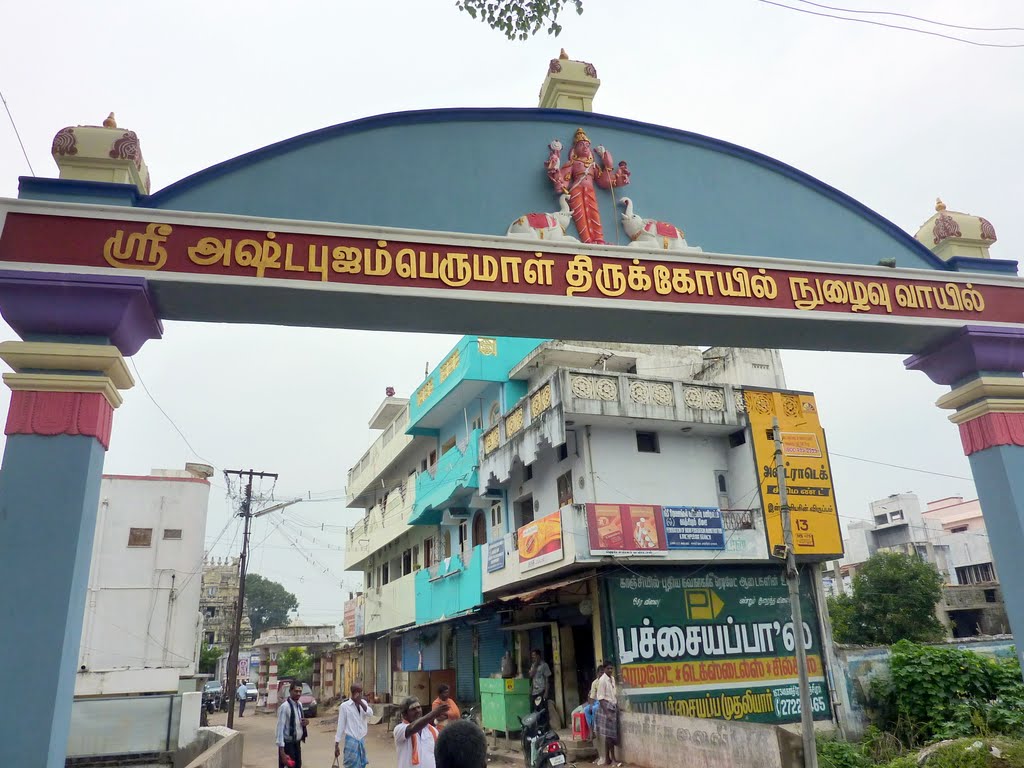 As he stepped in, a crocodile grabbed his foot and so the sage, in elephant form, shouted the name of the Lord and cried for help. The Lord Sri Ashta Bhuja Perumal came and rescued. Peyalwar says (3rd Tiruvandadi- 99) that the Lord with Eight weapons in the Eight arms, cut off the crocodile's neck. Thus, the Lord protects the devotees of this Kshetram with Eight arms. But the Lord in Viswaroopam has Thousands of arms and faces. He appeared in many colours. To some extent, we can say that in this Kshetram also the Lord is like in Viswaroopam!